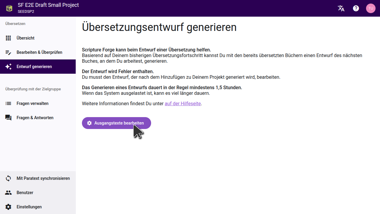 Nachdem Du das Formular ausgefüllt hast, wird das Scripture Forge Onboarding-Team Deine Anfrage prüfen und die besten Einstellungen für Dein Projekt ermitteln. Du erhältst einen oder mehrere Entwürfe zur Durchsicht. Fall Du Dich dafür entscheidest, dass die Erstellung von Entwürfen für Dein Projekt das Richtige ist, wird das Team das Generieren von Entwürfen für Dein Projekt aktivieren und Dich durch den Prozess der Auswahl der besten Einstellungen führen.