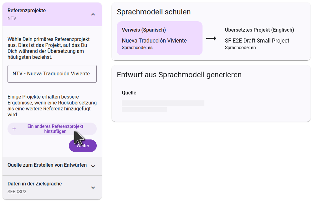 Das Referenzprojekt wird für die Schulung des Sprachmodells verwendet. Normalerweise ist dies das Projekt, auf das Du Dich während der Übersetzung am häufigsten beziehst, aber in manchen Fällen kannst Du bessere Ergebnisse erzielen, wenn Du ein anderes Projekt verwendest. In einzelnen Projekten ist die Wahl eines zweiten Referenzprojekts möglicherweise sinnvoll. Ein häufiger Anwendungsfall ist es, Deine Rückübersetzung als zweites Referenzprojekt auszuwählen.