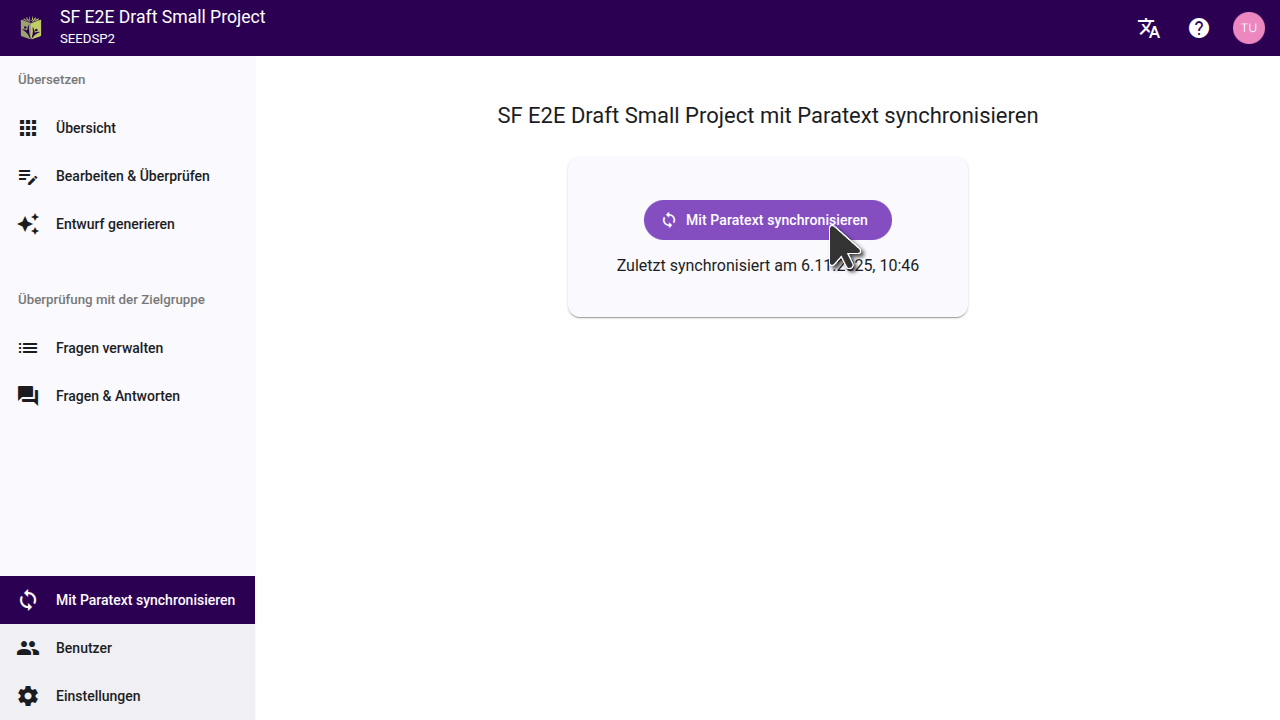 - Nachdem Du einen Entwurf zu Deinem Projekt in Scripture Forge hinzugefügt hast, vergiss bitte nicht, eine Synchronisierung durchzuführen, um die Daten auf dem Paratext-Server zu speichern. Generiere keinen neuen Entwurf, es sei denn, der erste wurde Deinem Projekt hinzugefügt. Ansonsten wird er nicht auf dem Paratext-Server gespeichert und die Daten gehen verloren.