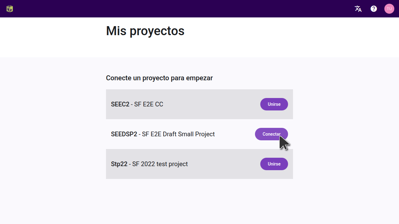 En la lista mostrada, podrá abrir proyectos si ya están conectados. También puede unirse a un proyecto o hacer clic en "Conectar" para conectar un proyecto por primera vez en Scripture Forge.