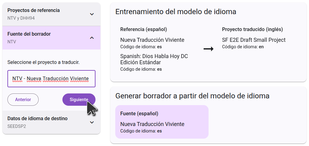 A la derecha, verá un diagrama de cómo se utilizarán los proyectos seleccionados para generar el borrador. En el primer paso, el modelo lingüístico aprenderá comparando los proyectos de referencia con el proyecto traducido. En el segundo paso, utilizará esos conocimientos para traducir el proyecto fuente.