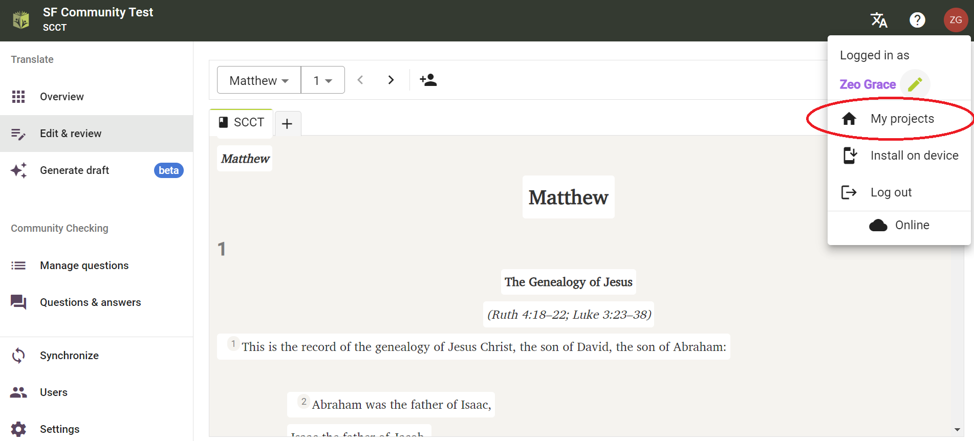 Une fois qu'un projet Paratext a été connecté à Scripture Forge, tous les utilisateurs qui sont membres du projet dans Paratext (sous Permissions utilisateurs) pourront ouvrir le projet dans Scripture Forge.