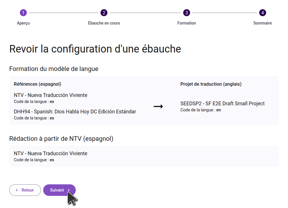 Si vous utilisez un projet Paratext séparé pour stocker les ébauches générées par l'IA, vérifiez que votre projet de traduction principal figure dans la section Données de la langue cible. Les ébauches doivent être générées à partir de votre projet principal afin que le modèle puisse tirer des enseignements de votre travail de traduction achevée.
