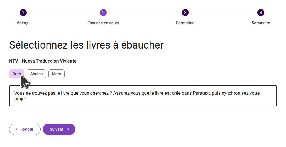 Dans la deuxième étape, sélectionnez les livres que vous voulez traduire. Si le livre que vous voulez ébaucher n'existe pas dans votre projet Paratext, vous devrez d'abord créer le livre dans Paratext. En général, nous suggérons de rédiger un livre à la fois, mais si vous rédigez des livres plus petits, vous voudrez peut-être en rédiger plusieurs à la fois.