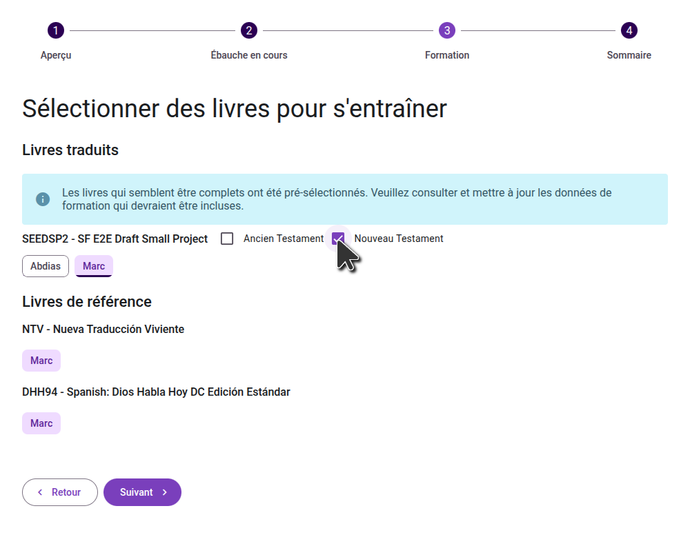 À l'étape suivante, sélectionnez les livres à utiliser pour former le modèle de langue, tant dans votre projet principal que dans les projets de référence. Choisissez tous les livres de votre projet qui ont été correctement revus. Bien qu'ils n'aient pas besoin d'être vérifiés par un consultant, ils devraient être des traductions exactes du livre source.