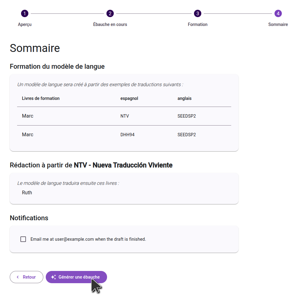 Lors de la dernière étape, consultez les livres que vous avez sélectionnés pour former le modèle, et les livres que vous avez sélectionnés pour ébaucher. Si vous devez apporter des modifications, vous pouvez passer aux étapes précédentes. Une fois que vous êtes satisfait de vos sélections, cliquez sur le bouton "Générer un brouillon" pour démarrer le processus.