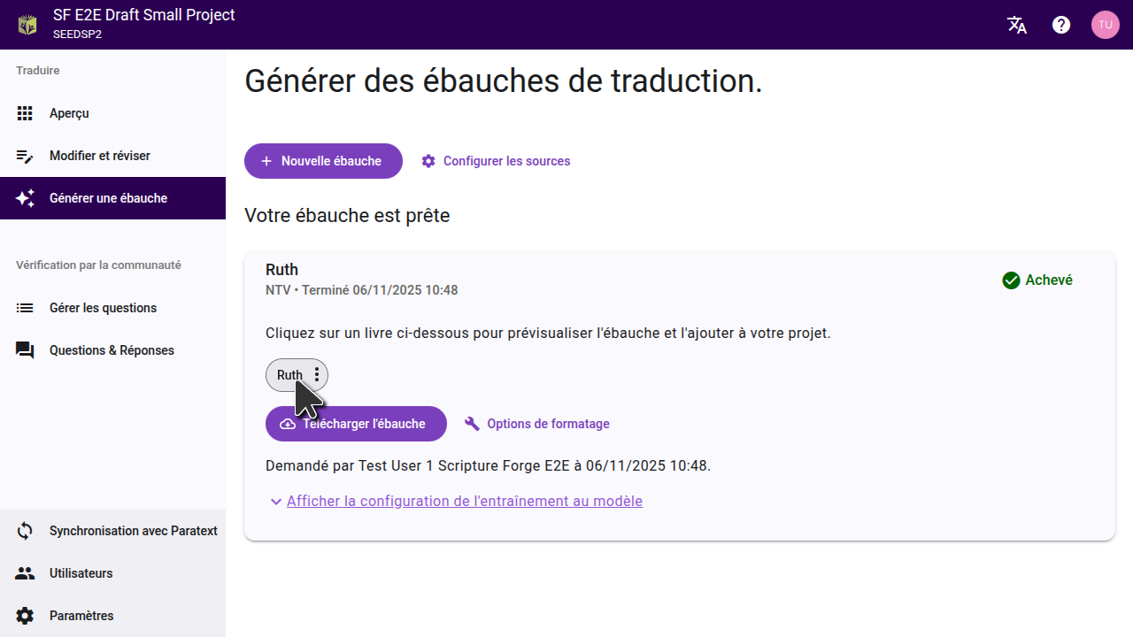 Si vous préférez ne pas importer l'ébauche directement dans votre projet, vous pouvez également télécharger l'ébauche sous forme de fichiers USFM. Dans la page "Générer l'ébauche ", cliquez sur "Télécharger l'ébauche ", et extrayez les fichiers sur votre ordinateur. Vous pouvez ensuite importer ces fichiers dans un projet dans Paratext.