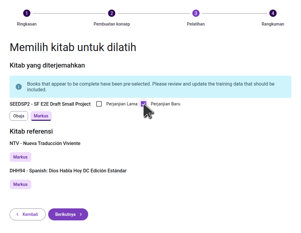 On the next step, select the books to use to train the language model, both in your main project, and in the reference projects. Choose all the books in your project that have been adequately reviewed. While they don't need to be consultant-checked, they should be accurate translations of the source book.