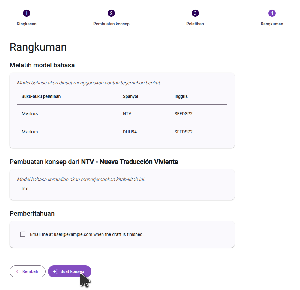 On the final step, review the books you selected to train the model, and the books you selected to draft. If you need to make any changes, you can go to the previous steps. Once you are happy with your selections, click the "Generate Draft" button to start the process.
