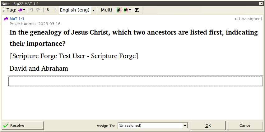 Catatan yang dihasilkan dari jawaban pemeriksaan masyarakat akan memiliki tagar catatan yang unik, dengan ikon yang berbeda dari catatan lain di proyek Paratext Anda. Anda dapat mengubah ikon dengan menyunting tagar catatan. Untuk detailnya, lihat artikel bantuan Paratext tentang tagar catatan khusus. Anda juga dapat memfilter catatan berdasarkan tag catatan mereka, yang memungkinkan Anda untuk hanya menampilkan tanggapan yang diperiksa oleh komunitas, atau menyembunyikannya dari tampilan.
